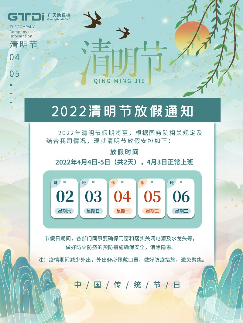 根据国务院办公厅《关于2022年部分节假日安排的通知》,并结合我司实际情况,FUN88·乐天堂(中国游)数控2022年清明节放假安排如下: