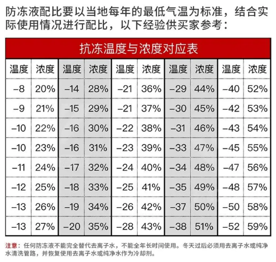 2、配比:零下20度以上建议浓度35%,零下30度建议浓度45%,零下40度建议浓度52%。具体的温度和浓度参照表如下图: