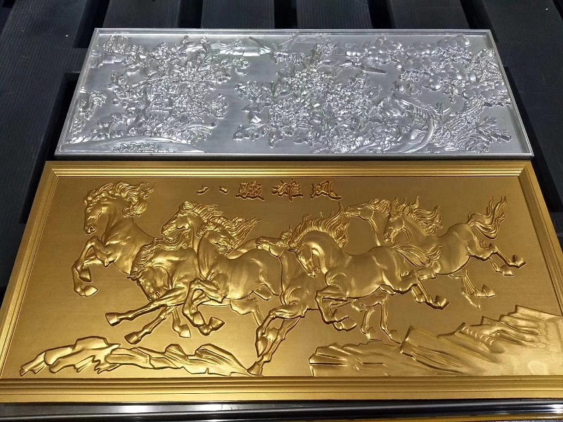 铜铝浮雕主要应用在装饰装修行业和广告标识标牌行,如铜铝门窗、护栏、屏风、楼梯、家具、金属标牌等。杰克铜铝浮雕机可制作阳雕和阴雕效果,浮雕厚度可自行设置。